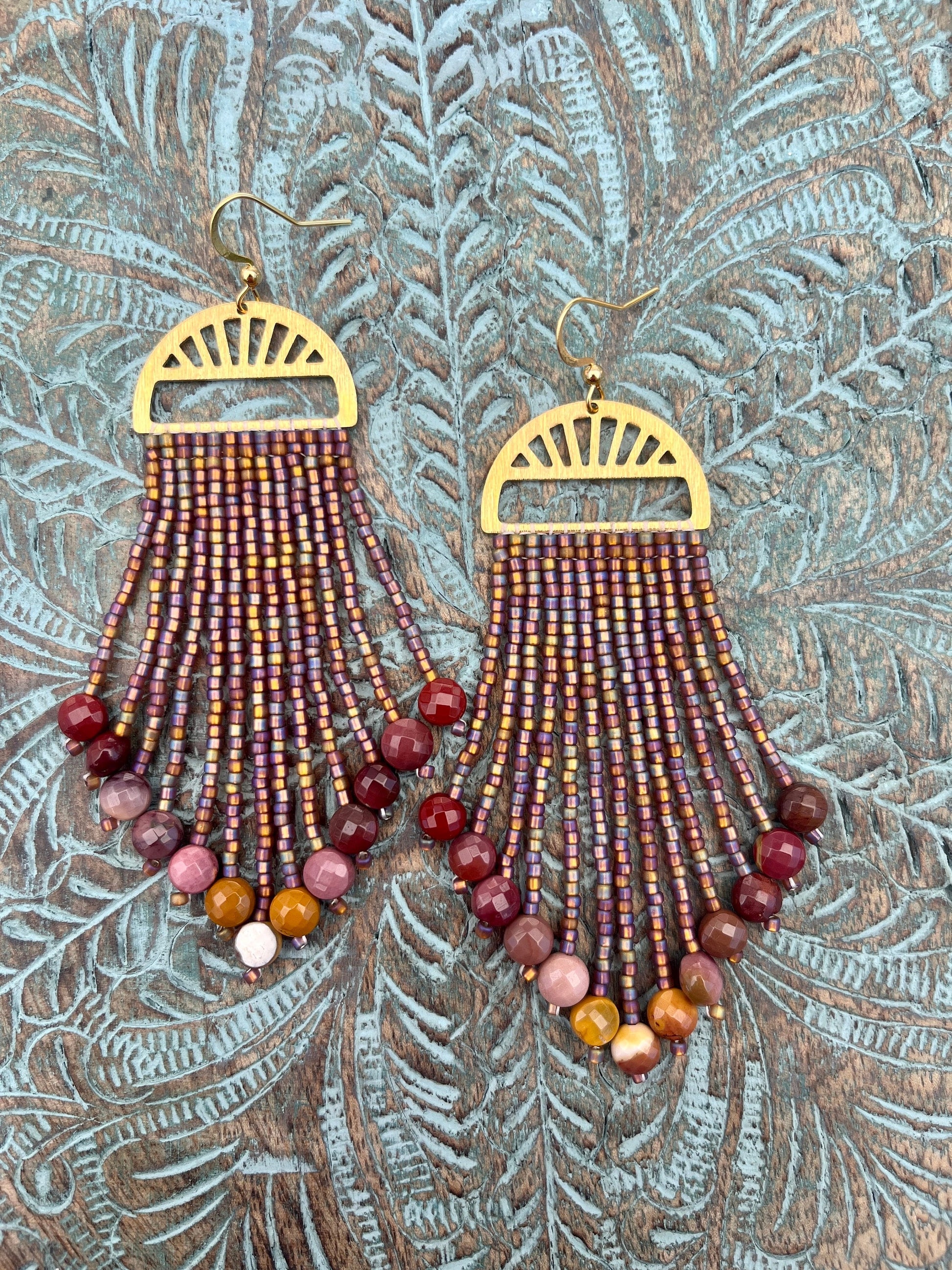 Made with brass tops, glass seed beads in a lined matte finish with plenty of sparkle, mookaite stone end pieces