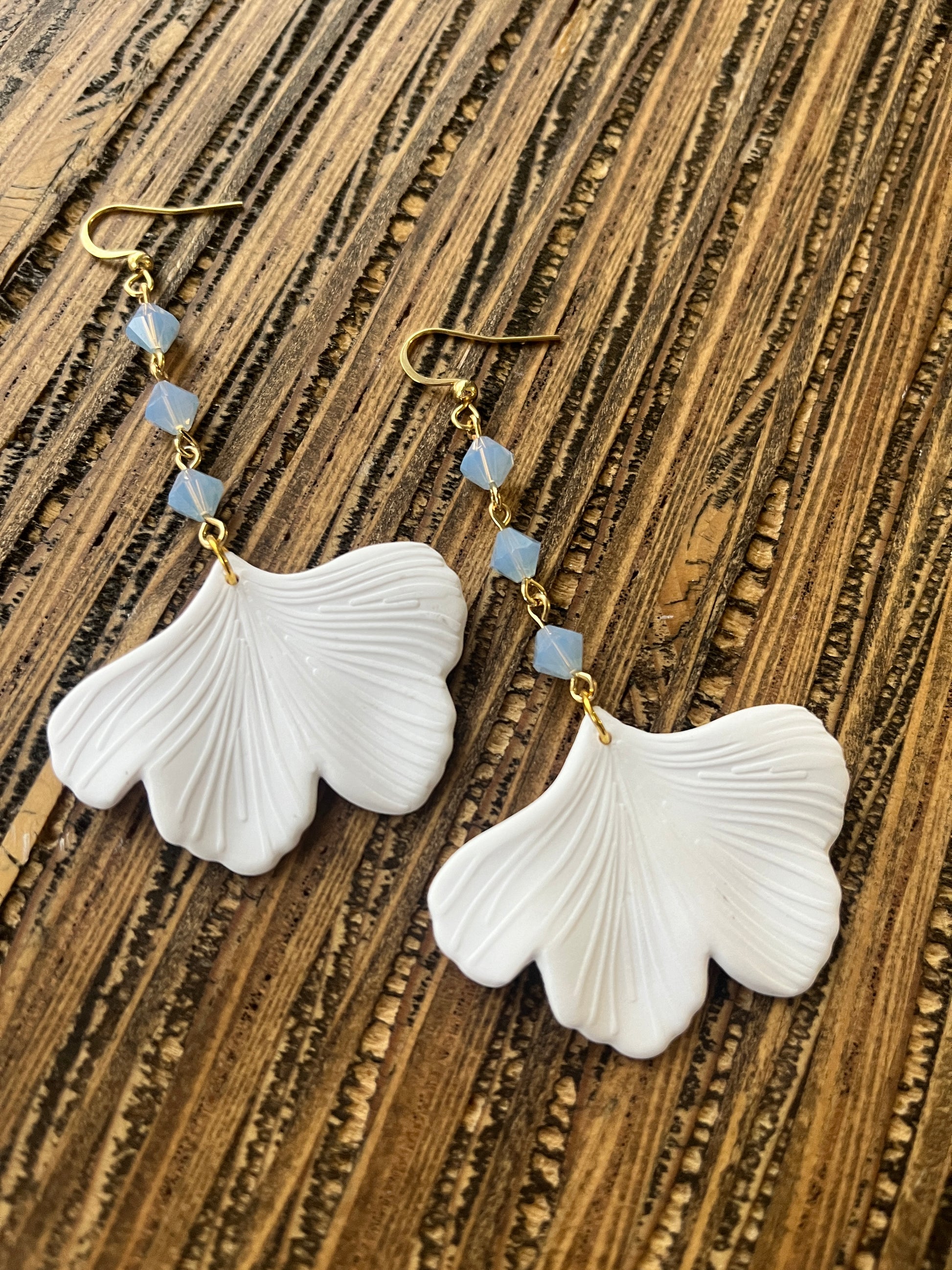 Light blue glass beads on drop chain and petals are made of lightweight clay
