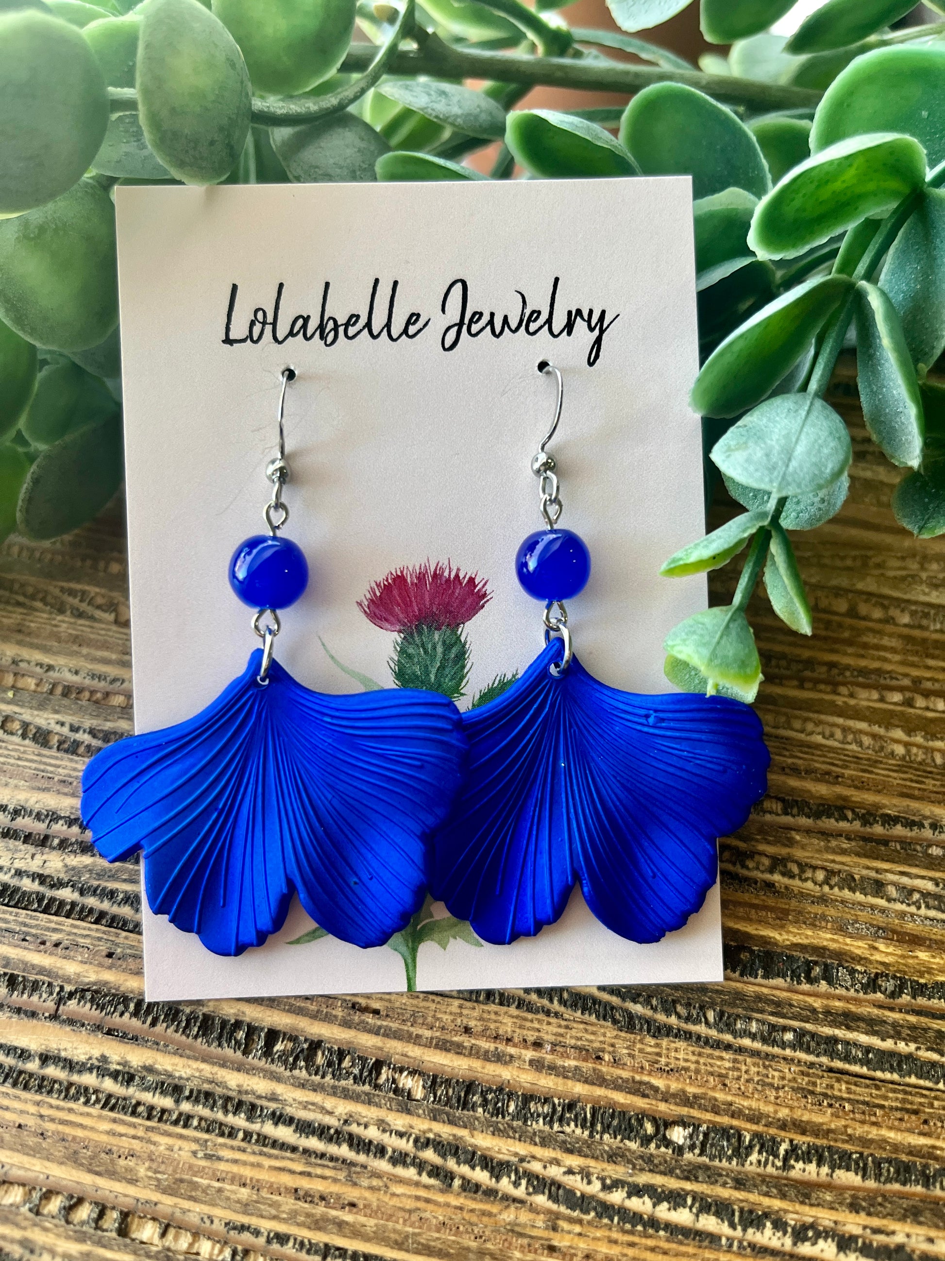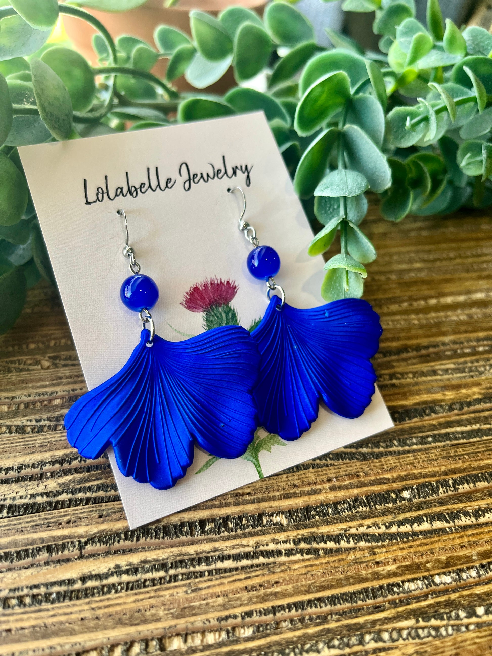 These blue clay ginkgo petal drops offer a light weight earring that is fun with a little shine.