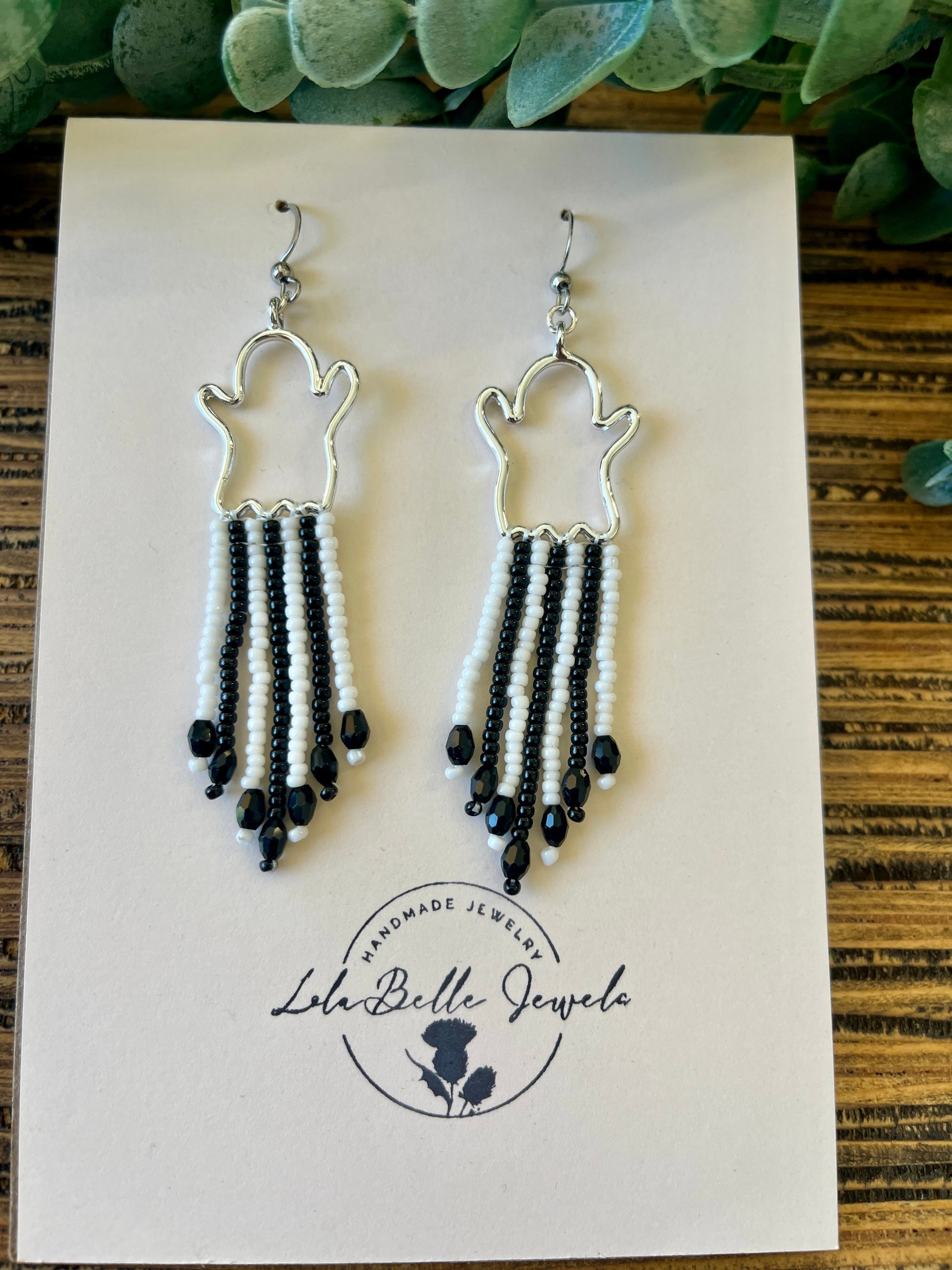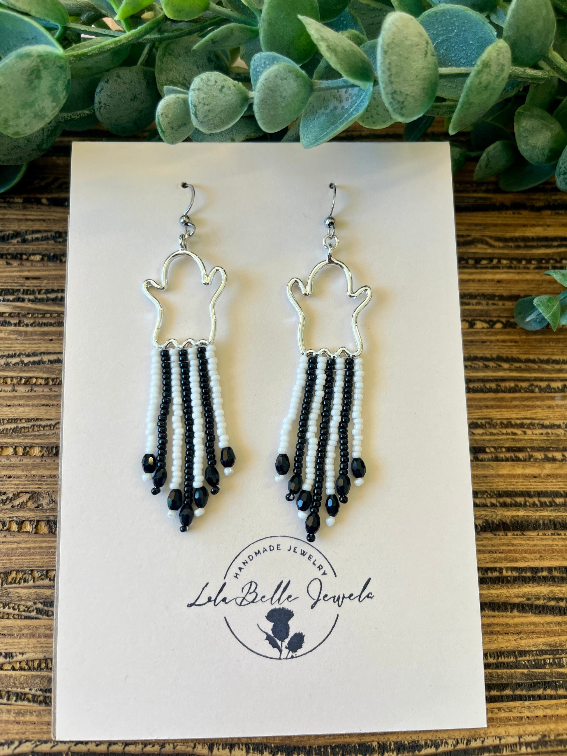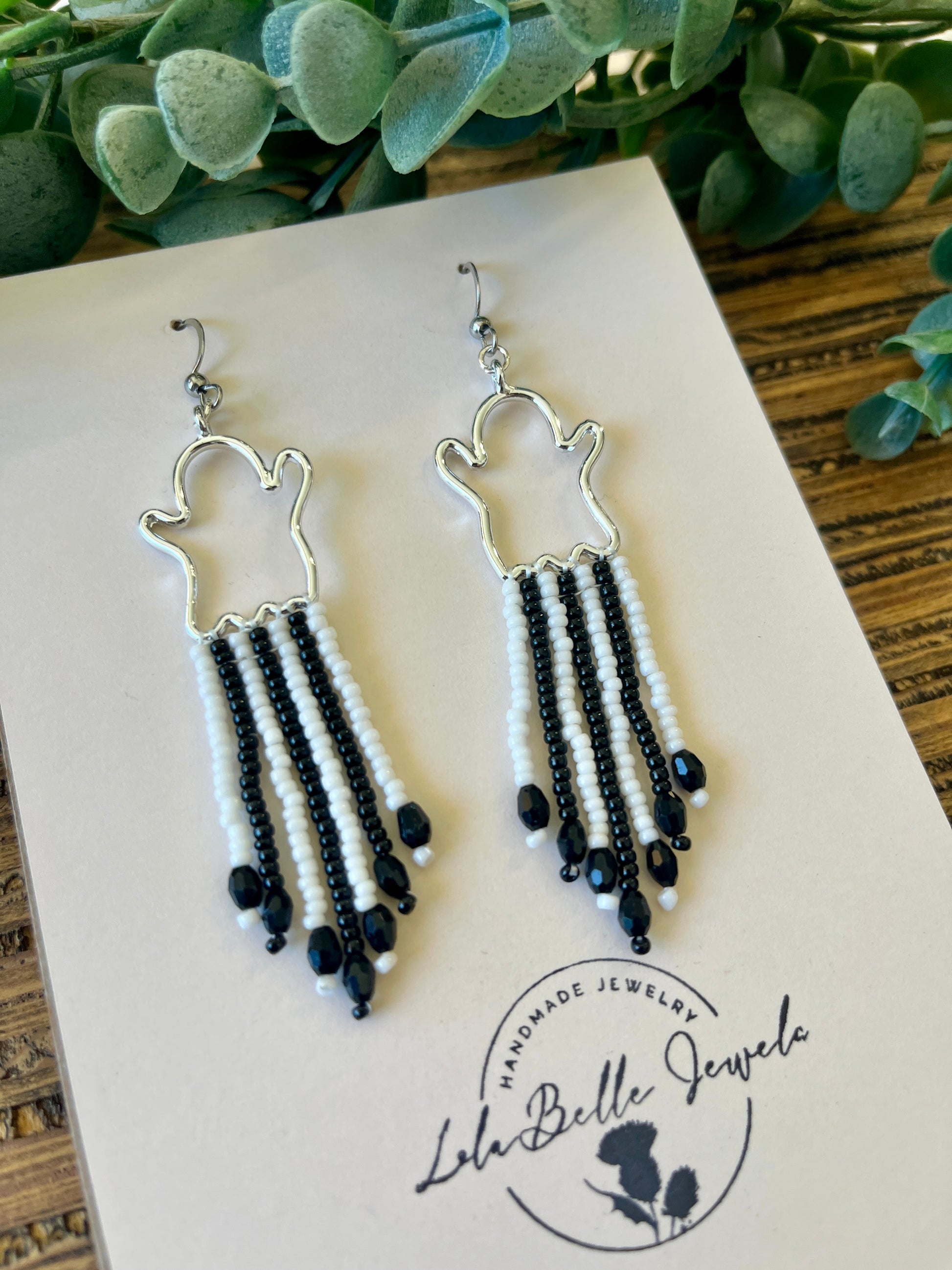 Silver Ghost Fringe Earrings, Short Fringe, Black and White