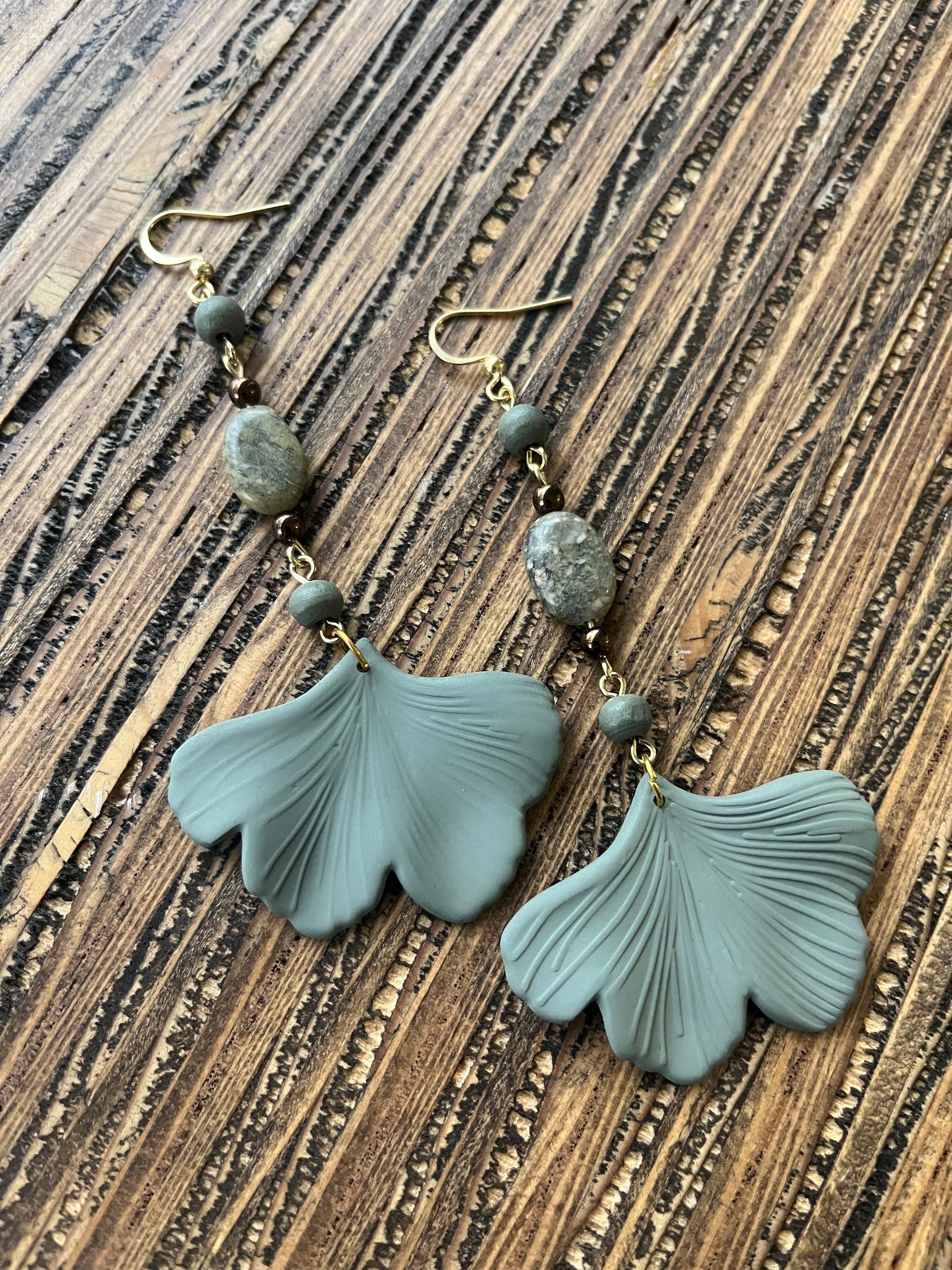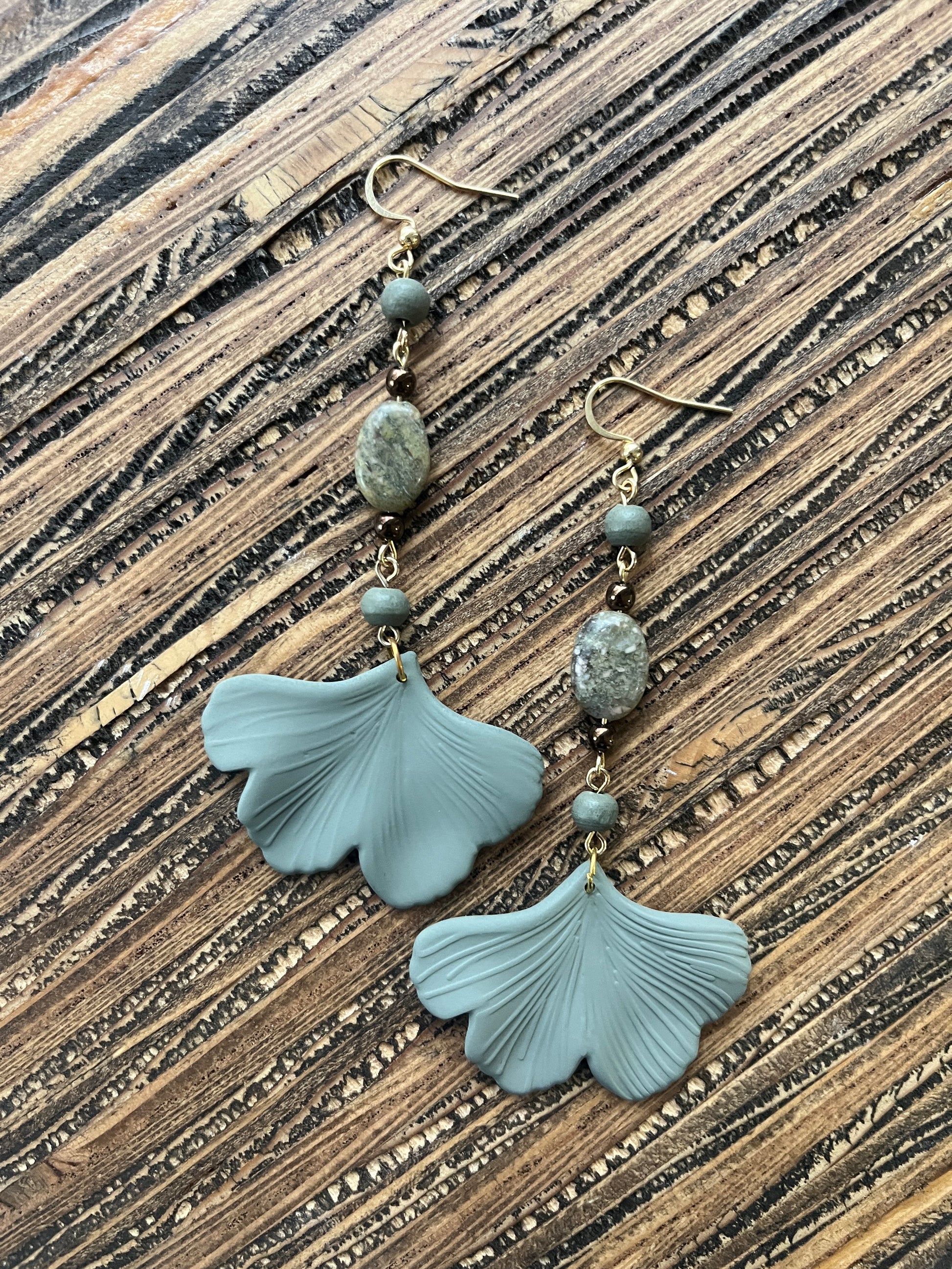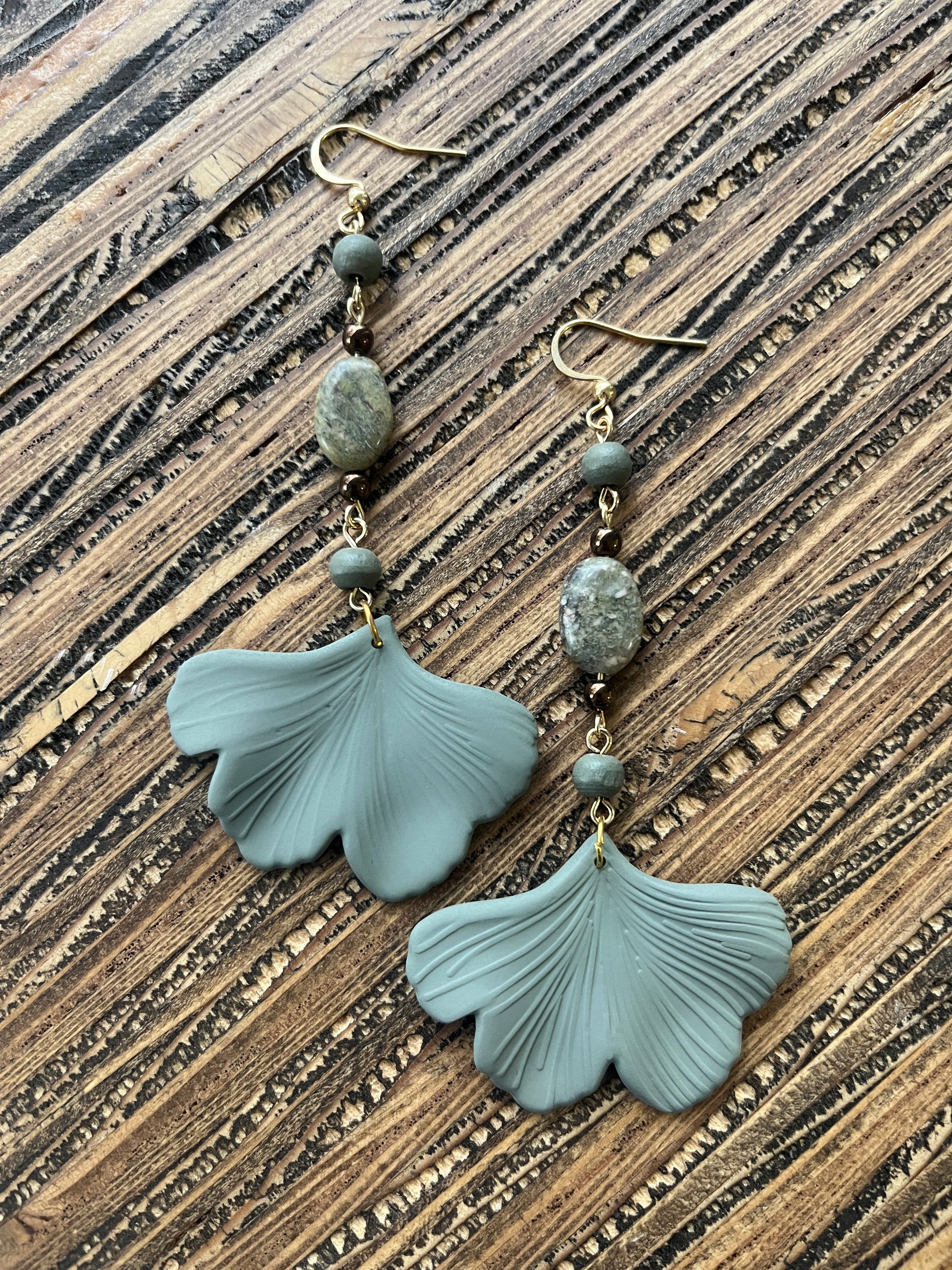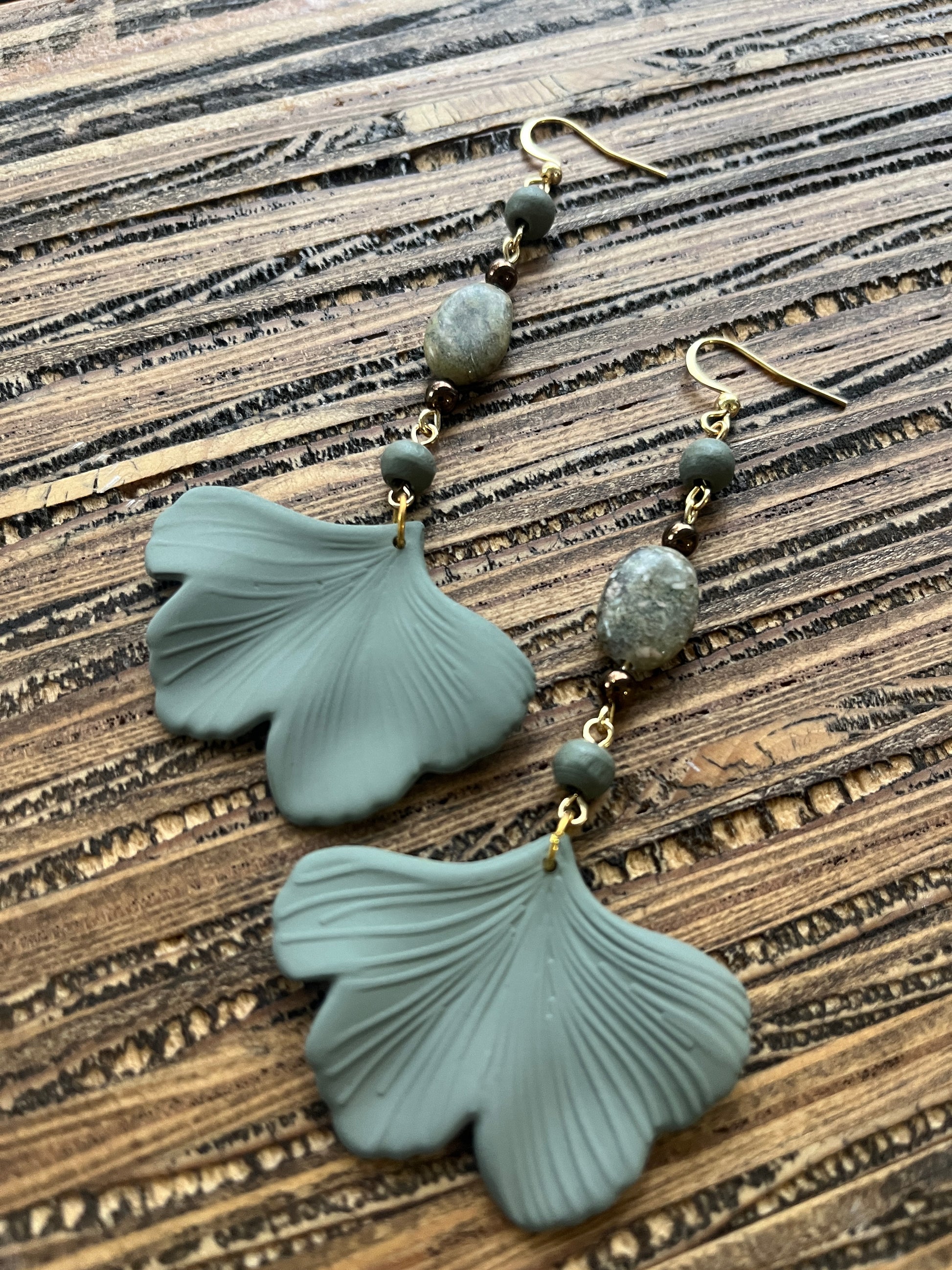 Stone and glass beads on drop chain and petals are made of lightweight clay